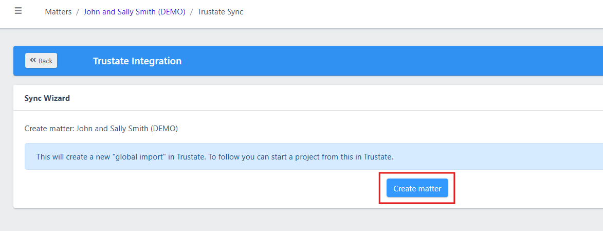 Once inside the sync screen, review the details and click Create matter to begin the process. This action will create a new "global import" in Trustate.