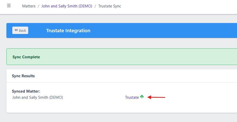 After the sync completes, you will see a Sync Complete confirmation along with a link to the synced matter in Trustate.