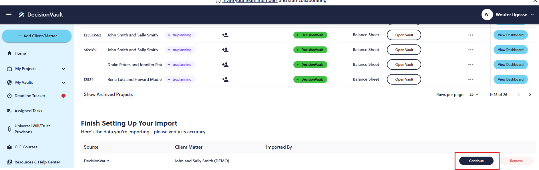 From your Trustate dashboard you will be able to finish setting up the import. On the import screen, review the matter and click Continue to proceed.