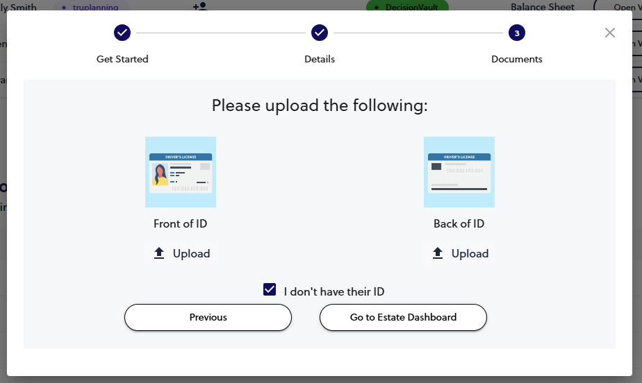 On the following step, you can upload identification documents if they are available. If not, select "I don’t have their ID" and click Go To Estate Dashboard.