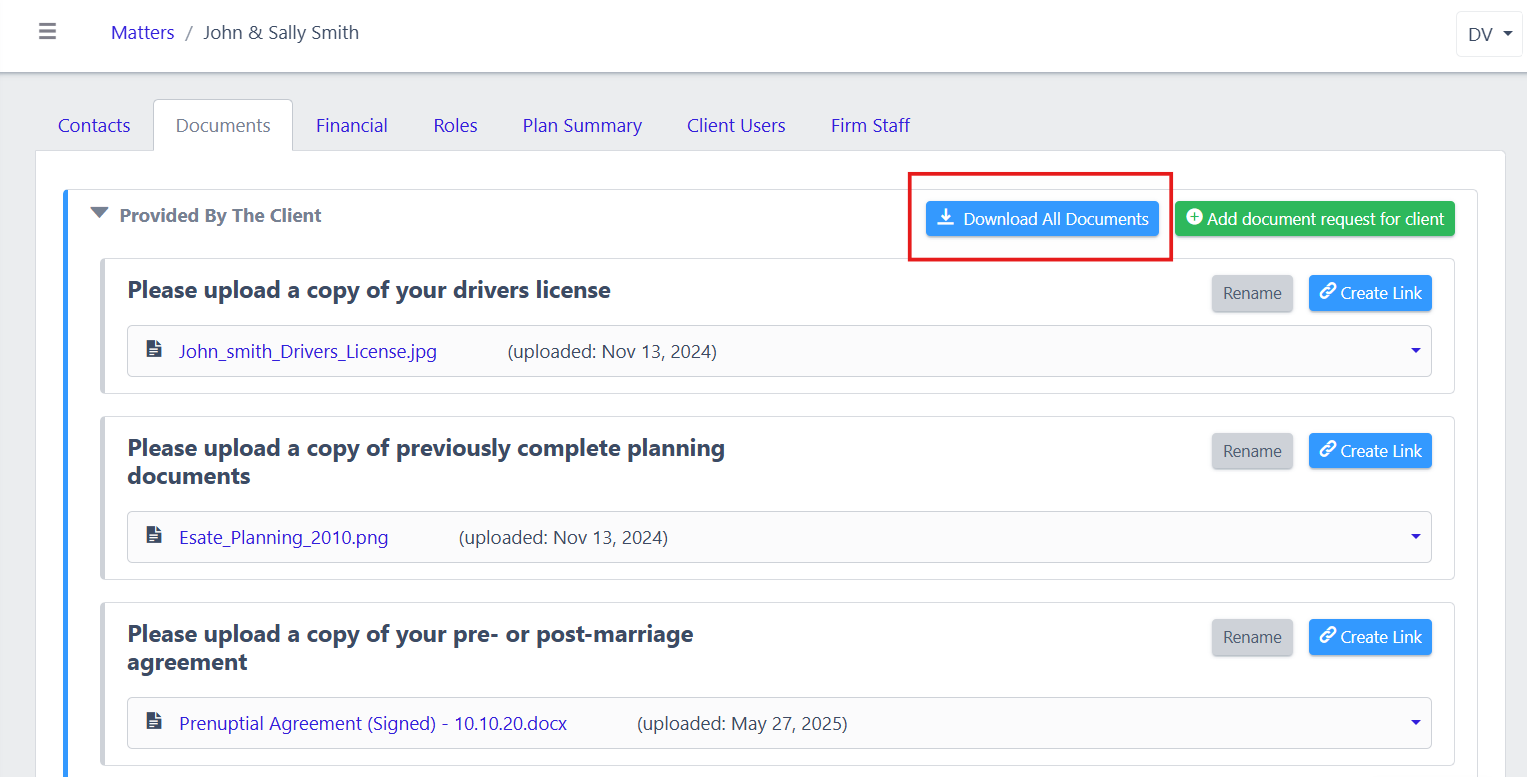 Firms can now quickly download all documents uploaded by the client for a matter in one go. This saves time when you need to review or archive multiple files at once without having to download each document individually.