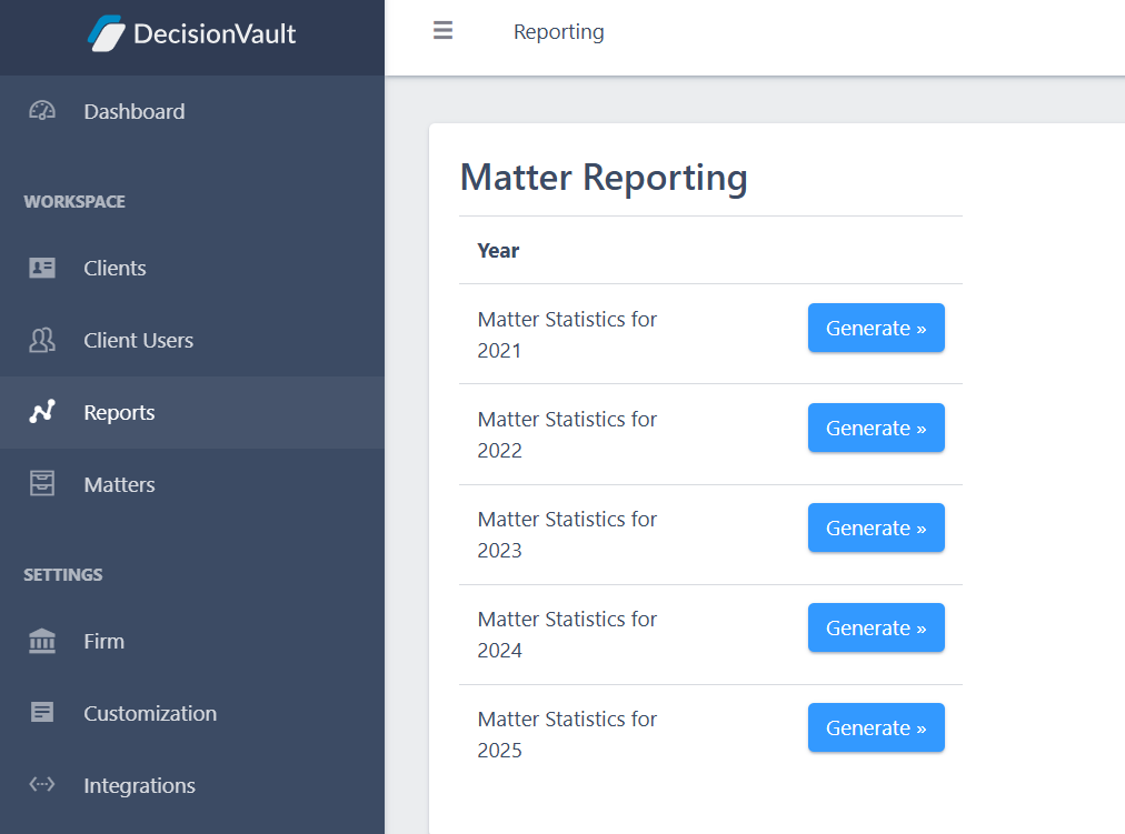 The Reporting section gives firms an overview of their activity and client trends over time. You can generate Matter Statistics Reports by year to see how your firm’s intake and matter types have evolved to identify growth patterns and client demographics.