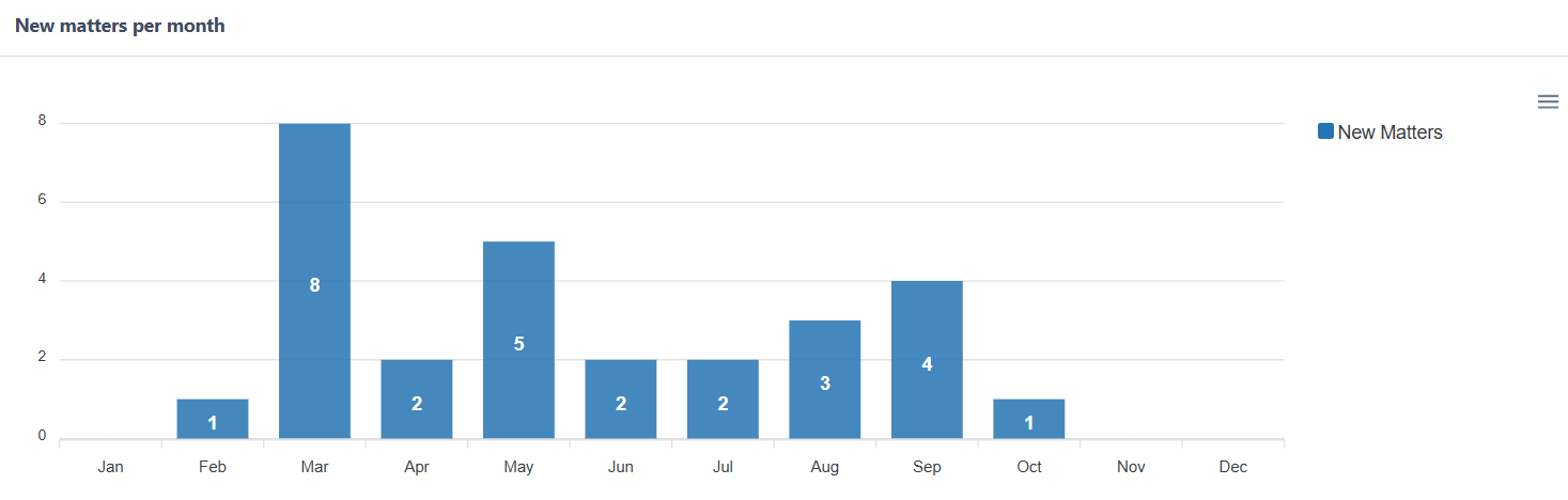 - New matters per month: See how many new matters were opened each month, helping you track busy periods and growth trends.