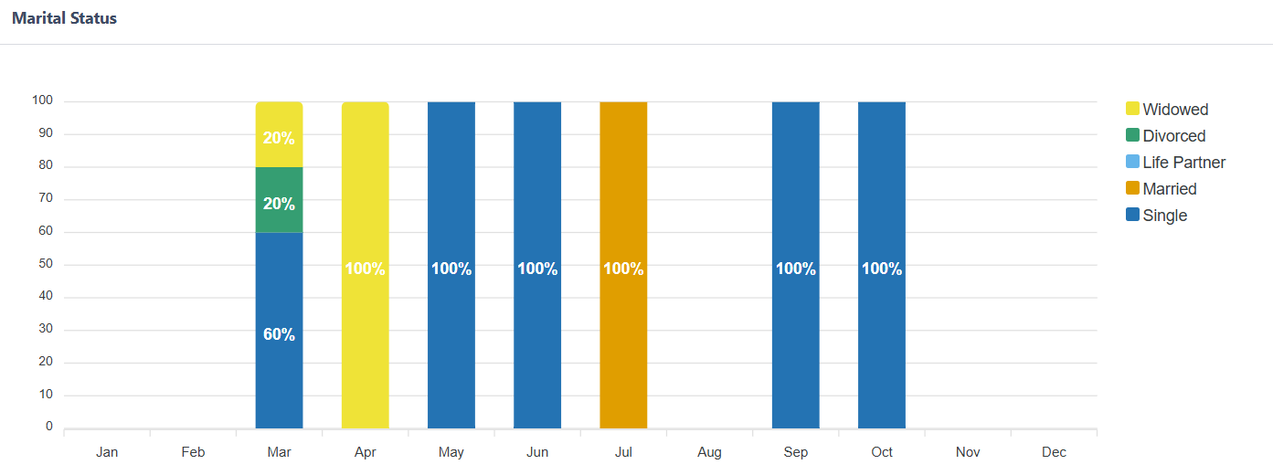 - Marital status: Get a breakdown of the marital statuses of clients represented in your matters — such as Married, Single, Divorced, or Widowed. This helps identify trends across client demographics.