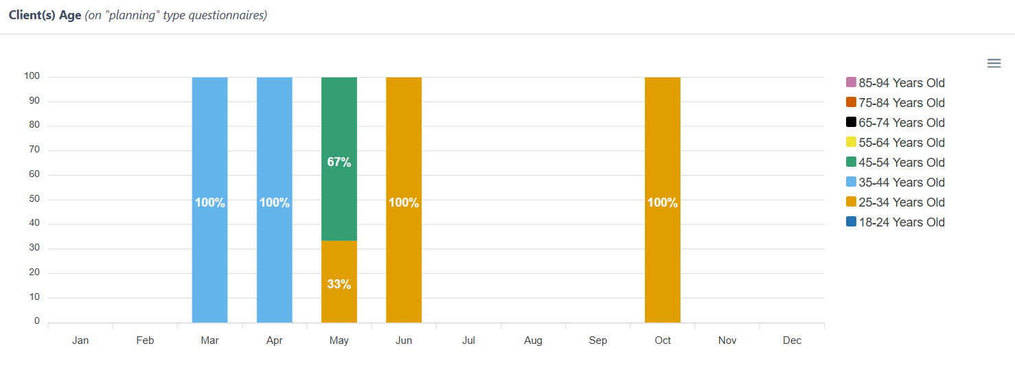 Client age and children (on planning type questionnaires) : View the distribution of client ages and whether they have children (adult, minor, or none).