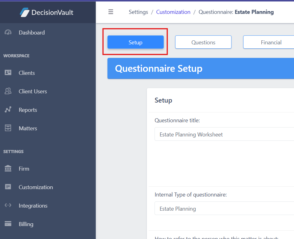 - Open the questionnaire you want to update (for example, Estate Planning) and move to the Setup tab at the top.