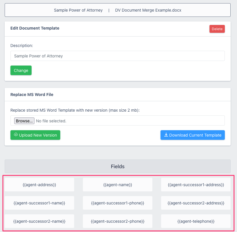The "edit template" screen will list the placeholder/fields that were found in the Word document: