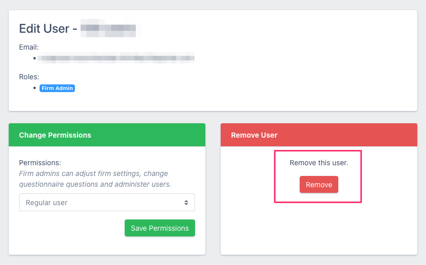 One thing to note is that you cannot remove the user flagged as the "account owner". If you need to make changes to the account owner you need to designate another Firm Admin to be the owner first and then to follow you'll be able to delete the user.